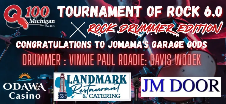 The last rock drummer standing will be declared the grand prize winner of the 2025 Q100 Michigan Odawa Casino Tournament of Rock 6.0 Rock Drummer Edition! The listener assigned to the Champion Rock Drummer will be deemed the grand prize winner and will receive the $2,050 Grand Prize Package, which includes $500 cash, $500 in Gift Certificates from Odawa Casino, thirty-two $25 gift certificates from participating sponsors, and five $50 gift certificates from participating sponsors.